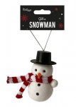It encompasses a white glittered snowman figure with a woollen scarf and hat with an attached hanging string.